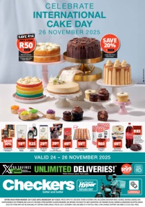 26 NOVEMBER 2025 CELEBRATE INTERNATIONAL CAKE DAY VALID 24 – 26 NOVEMBER 2025 OFFERS VALID FROM MONDAY 24/11/2025 UNTIL WEDNESDAY 26/11/2025. PRICES APPLY TO CHECKERS STORES EASTERN CAPE, INCLUDING BEAUFORT WEST, GEORGE, KNYSNA, MOSSEL BAY, OUDTSHOORN & PLETTENBERG BAY. ALSO AT CHECKERS HYPER BAYWEST & EDEN MEANDER. WE RESERVE THE RIGHT TO LIMIT QUANTITIES. NO TRADERS PLEASE. ERRORS & OMISSIONS EXCEPTED (E&OE). SELECTED ITEMS MAY NOT BE AVAILABLE AT CERTAIN STORES. WHILE STOCKS LAST. CUSTOMER CARE LINE 0800 01 07 09 (TOLL-FREE). XTRA SAVINGS SUPPORT LINE 0800 33 33 85 (TOLL-FREE). UNLIMITED DELIVERIES!* MONTHLY SUBSCRIPTION *R350 minimum spend. T&Cs apply. Click here to download the app also at BAYWEST, PORT ELIZABETH EDEN MEANDER, GEORGE R99 ONLY PER MONTH ECFOCCDROK/E Large Bar-One Cake Each WITH CARD SAVE 20% Bar-One/Black Forest/Oreo/Lemon Condensed Milk Cake Slices R50 WITH CARD ANY 2 FOR SAVE R16 The Kitchen Baking Powder 1999200g SAVE 30% WITH CARD Nestlé Cocoa Powder 4999 62,5g SAVE R10 WITH CARD The Kitchen Icing/Castor Sugar 2999 500g each SAVE 15% WITH CARD 40ml Robertsons Vanilla Essence 2 FOR R25 SAVE 15% WITH CARD First Choice Salted Butter/ Softy Butter Spread 6999 500g each SAVE R15 WITH CARD 2,5kg Sasko Cake Wheat Flour 2 FOR R60 SAVE R20 WITH CARD BUY ANY 2 & Ina Paarman’s Cake/Dessert Mix All Variants SAVE 30% WITH CARD Housebrand/Farmyard Large Eggs 5999 SAVE R25 WITH CARD 30 per pack Golden Cloud Cake Mix All Variants 700g/800g 3999 each SAVE R40 WITH CARD Small Ferrero Rocher/Oreo Cake Each & 1,5l Coca-Cola Original Taste Less Sugar Soft Drink BOTH FOR R85 SAVE R26 WITH CARD