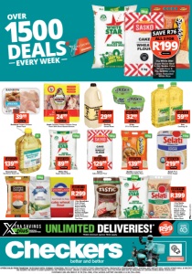 D’lite 37% Fat Spread 32991kg each SAVE 15% WITH CARD Rainbow Frozen Chicken Braai Pack 3999750g WITH CARD Goldi Chicken Frozen Chicken Soup Pack With Brine-Based Mixture 24991kg SAVE 25% WITH CARD OVER EVERY WEEK 1500 DEALS ECFOCCDUCF/E 5kg White Star Super Maize Meal & 5kg Sasko Cake Wheat Flour & 5kg Spekko Long Grain Parboiled White Rice R199 WITH CARD ALL 3 FOR SAVE R76 White Star Super Maize Meal 899910kg SAVE R40 WITH CARD 10kg Sasko Cake Wheat Flour 1299910kg SAVE R20 WITH CARD 10kg 10kg 4l 10kg 10kg 10kg Snowflake Cake Wheat Flour & 10kg Super White Super Maize Meal & 10kg Golden Delight Long Grain White Parboiled Thai Rice ALL 3 FOR R299 SAVE R111 WITH CARD 5kg 10kg UNLIMITED DELIVERIES!* MONTHLY SUBSCRIPTION R99 ONLY PER MONTH *R350 minimum spend. T&Cs apply. Click here to download the app OFFERS VALID FROM THURSDAY 19/03/2026 UNTIL SUNDAY 12/04/2026. PRICES APPLY TO CHECKERS STORES GRAHAMSTOWN, GREENACRES, HEMINGWAYS MALL, KNYSNA, KWT METLIFE MALL, NGEBS, NONESI MALL & VINCENT. WE RESERVE THE RIGHT TO LIMIT QUANTITIES. NO TRADERS PLEASE. ERRORS & OMISSIONS EXCEPTED (E&OE). SELECTED ITEMS MAY NOT BE AVAILABLE AT CERTAIN STORES. WHILE STOCKS LAST. CUSTOMER CARE LINE 0800 01 07 09 (TOLL-FREE). XTRA SAVINGS SUPPORT LINE 0800 33 33 85 (TOLL-FREE). 10kg Tastic Long Grain Parboiled White Rice & 10kg Selati Golden Brown Sugar & 10kg White Star Super Maize Meal ALL 3 FOR R399 SAVE R191 WITH CARD Pan Cooking Oil 59992l each SAVE R10 WITH CARD Spekko Long Grain Parboiled White Rice 1399910kg SAVE R50 WITH CARD Selati Pure White Sugar 2199910kg SAVE R40 WITH CARD Darling Amasi Maas 29992kg SAVE R10 WITH CARD Housebrand Sunflower Seed Oil 139994l SAVE R15 WITH CARD