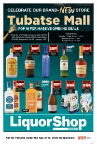 we bring the wine route to you Page 2 Finest Whiskies at Supermarket Prices. CHEERS TO CIDERS & BEERS 54999 750ml Glenfiddich 12-Year-Old Single Malt Scotch Whisky WITH CARD R195 2 x 6x440ml NRB/6x500ml Cans Windhoek Premium Draught Beer SAVE R45 ANY 2 FOR WITH CARD R190 3 x 6x330ml Flying Fish Premium Lemon Flavoured Beer NRB SAVE R95 3 FOR 500ml WITH CARD R140 2 x 6x275ml Brutal Fruit Sparkling Ruby Apple/ Litchi Sèche/ Strawberry Rouge Spirit Cooler NRB SAVE R50 ANY 2 FOR OFFERS VALID FROM FRIDAY 19/12/2025 UNTIL SUNDAY 04/01/2026. PRICES APPLY TO CHECKERS LIQUORSHOP TUBATSE MALL, SHOP NO. L79, TUBATSE CROSSING MALL, C/O R37 (DIRK WINTERBACH STREET) & R555 ROAD, BEING ERF 8366, BURGERSFORT, EXT.30, LIMPOPO, 1150. WE RESERVE THE RIGHT TO LIMIT QUANTITIES. NO TRADERS PLEASE. LIQUOR ONLY AVAILABLE AT STORES WITH A VALID LIQUOR LICENCE. ALL WINE OFFERS ALSO AVAILABLE AT LIQUORSHOP TUBATSE MALL. ERRORS & OMISSIONS EXCEPTED (E&OE). WHILE STOCKS LAST. CUSTOMER CARE LINE 0800 01 07 09 (TOLL-FREE). XTRA SAVINGS SUPPORT LINE 0800 33 33 85 (TOLL-FREE). GNLSLCALMM/E WITH CARD 14999 Amarula Cream Liqueur All Variants Each SAVE R35 750ml WITH CARD 16999 Vat 69 Blended Scotch Whisky SAVE R40 750ml 440ml WITH CARD 20999 J&B Blended Scotch Whisky SAVE R50 750ml WITH CARD 24999 Johnnie Walker Red Label Blended Scotch Whisky SAVE R40 750ml WITH CARD 39999 Monkey Shoulder Blended Malt Scotch Whisky SAVE R70 750ml 28999 750ml Jack Daniel’s Original/Apple/ Honey Tennessee Whiskey Each WITH CARD R190 2 x 6x355ml Corona Extra/Cero Beer NRB SAVE R40 ANY 2 FOR WITH CARD R175 2 x 6x330ml Heineken Premium Silver/ Original Lager Beer NRB SAVE R45 ANY 2 FOR Not for Persons Under the Age of 18. Drink Responsibly. WITH CARD 17499 KWV 3-Year-Old Brandy SAVE R35 750ml WITH CARD 27999 Tanqueray London Dry/ Flor De Sevilla/Royale Gin Each SAVE R70 750ml WITH CARD 17499 Captain Morgan Original Spiced Gold Rum SAVE R25 750ml 26999 750ml Aperol Spirit Cooler 15499 750ml Smirnoff 1818 Original/ Infusions Vodka Each WITH CARD R210 2 x 750ml La Motte Millennium Merlot Cabernet Franc Red Wine SAVE R50 2 FOR WITH CARD 12499 Kanonkop Kadette Cape Red Blend Wine SAVE R25 750ml WITH CARD 7999 Durbanville Hills Chenin Blanc White Wine SAVE R15 750ml WITH CARD 8499 Diemersdal Sauvignon Blanc White Wine SAVE R20 750ml WITH CARD 9999 J.C. Le Roux Nectar Demi-Sec Rosé Sparkling Wine SAVE R20 750ml