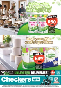 UNLIMITED DELIVERIES!* MONTHLY SUBSCRIPTION R99 ONLY PER MONTH *R350 minimum spend. T&Cs apply. Click here to download the app OFFERS VALID FROM MONDAY 02/03/2026 UNTIL SUNDAY 08/03/2026. PRICES APPLY TO CHECKERS & CHECKERS HYPER & CHECKERS FOODS STORES GAUTENG, BRITS, LIMPOPO, MPUMALANGA & RUSTENBURG; EXCEPT MAFIKENG, LICHTENBURG & ZEERUST STORES. WE RESERVE THE RIGHT TO LIMIT QUANTITIES. NO TRADERS PLEASE. ERRORS & OMISSIONS EXCEPTED (E&OE). SELECTED ITEMS MAY NOT BE AVAILABLE AT CERTAIN STORES. WHILE STOCKS LAST. CUSTOMER CARE LINE 0800 01 07 09 (TOLL-FREE). XTRA SAVINGS SUPPORT LINE 0800 33 33 85 (TOLL-FREE). GNFOCLDTPA/E GNFOCLDTWV/E 6499 WITH CARD Twinsaver Classic 2-Ply/ Luxury 3-Ply Toilet Rolls SAVE R22 9 per pack Twinsaver Mighty Big Classic White Roller Towel x 2 R50 WITH CARD BUY 2 FOR SAVE R26