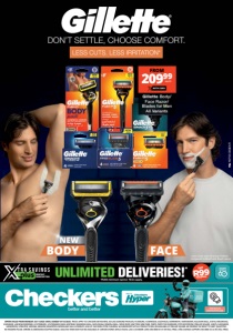 UNLIMITED DELIVERIES!* MONTHLY SUBSCRIPTION R99 ONLY PER MONTH *R350 minimum spend. T&Cs apply. Click here to download the app *Less Cuts. Less Shaving Irritation compared to Blue2 and Blue3 razors. BODY NEW FACE DON’T SETTLE, CHOOSE COMFORT. LESS CUTS. LESS IRRITATION* OFFERS VALID FROM MONDAY 24/11/2025 UNTIL SUNDAY 07/12/2025. PRICES APPLY TO CHECKERS BETHLEHEM, DE AAR, DIAMOND PAVILION, FICKSBURG, FLAMWOOD, GOLDFIELDS, HARRISMITH, HARTSWATER, KALAHARI MALL, KATHU, KROONSTAD, KURUMAN, LANGENHOVENPARK, LICHTENBURG, LICHTENBURG DADA-SENTRUM, MAHIKENG MALL, MATLOSANA, MIMOSA MALL, MOOI RIVER JUNCTION, NEW PARK, PARYS, PARYS THE RIVERSHED, POTCHEFSTROOM, PRELLER SQUARE, SAINTS, SASOLBURG, UNIVERSITAS, UPINGTON, VIRGINIA, WELKOM, WILKOPPIES. WOODLAND HILLS & ZEERUST. ALSO AT CHECKERS HYPER FLEURDAL & KLERKSDORP. NOT ALL PRODUCTS WILL BE AVAILABLE AT PRELLER SQUARE. WE RESERVE THE RIGHT TO LIMIT QUANTITIES. NO TRADERS PLEASE. ERRORS & OMISSIONS EXCEPTED (E&OE). SELECTED ITEMS MAY NOT BE AVAILABLE AT CERTAIN STORES. WHILE STOCKS LAST. CUSTOMER CARE LINE 0800 01 07 09 (TOLL-FREE). XTRA SAVINGS SUPPORT LINE 0800 33 33 85 (TOLL-FREE). NCFOCCDQEX/E Gillette Body/ Face Razor/ Blades for Men All Variants WITH CARD 20999 each FROM