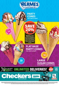 UNLIMITED DELIVERIES!* MONTHLY SUBSCRIPTION R99 ONLY PER MONTH *R350 minimum spend. T&Cs apply. Click here to download the app LARGE SUGAR CONES SCRUMPTIOUS, CRISPY & DELICIOUS PARTY CONES FUN, LIGHT & CRISPY FUN, LIGHT & CRISPY FLAT BASE PARTY CONES Hermes 24 Per Pack Coloured Party Cones/28 Per Pack Flat Bottom Party Cones/10 Per Pack Large Sugar Cones WITH CARD BUY ANY & SAVE 20% OFFERS VALID FROM MONDAY 16/03/2026 UNTIL MONDAY 27/04/2026. PRICES APPLY TO CHECKERS BETHLEHEM, DE AAR, DIAMOND PAVILION, FLAMWOOD, GOLDFIELDS, HARRISMITH, HARTSWATER, KALAHARI MALL, KATHU, KROONSTAD, KURUMAN, KURUMAN SQUARE, LANGENHOVENPARK, LICHTENBURG, LICHTENBURG DADA CENTRE, MAHIKENG MALL, MATLOSANA, MIMOSA MALL, MOOI RIVER JUNCTION, NEW PARK, PARYS, PARYS THE RIVERSHED, POTCHEFSTROOM, PRELLER SQUARE, SAINTS, SASOLBURG, UNIVERSITAS, UPINGTON, VIRGINIA, WELKOM, WILKOPPIES, WOODLAND HILLS & ZEERUST. ALSO AT CHECKERS HYPER FLEURDAL & KLERKSDORP. NOT ALL PRODUCTS WILL BE AVAILABLE AT PRELLER SQUARE. WE RESERVE THE RIGHT TO LIMIT QUANTITIES. NO TRADERS PLEASE. ERRORS & OMISSIONS EXCEPTED (E&OE). SELECTED ITEMS MAY NOT BE AVAILABLE AT CERTAIN STORES. WHILE STOCKS LAST. CUSTOMER CARE LINE 0800 01 07 09 (TOLL-FREE). XTRA SAVINGS SUPPORT LINE 0800 33 33 85 (TOLL-FREE). NCFOCCDUFK/E