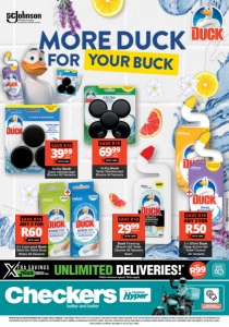 YOUR BUCK MORE DUCK FOR UNLIMITED DELIVERIES!* MONTHLY SUBSCRIPTION R99 ONLY PER MONTH *R350 minimum spend. T&Cs apply. Click here to download the app 2 x 3 per pack Duck Stick-On Toilet Bowl Strips All Variants WITH CARD ANY 2 FOR R60 SAVE R14 WCFOCCDQUD/E OFFERS VALID FROM MONDAY 08/12/2025 UNTIL SUNDAY 11/01/2026. PRICES APPLY TO CHECKERS & CHECKERS HYPER STORES WESTERN CAPE, EXCEPT BEAUFORT WEST, GEORGE, KNYSNA, MOSSEL BAY, OUDTSHOORN & PLETTENBERG BAY. WE RESERVE THE RIGHT TO LIMIT QUANTITIES. NO TRADERS PLEASE. ERRORS & OMISSIONS EXCEPTED (E&OE). SELECTED ITEMS MAY NOT BE AVAILABLE AT CERTAIN STORES. WHILE STOCKS LAST. CUSTOMER CARE LINE 0800 01 07 09 (TOLL-FREE). XTRA SAVINGS SUPPORT LINE 0800 33 33 85 (TOLL-FREE). 2 x 500ml Duck Deep Action Gel Toilet Cleaner All Variants WITH CARD ANY 2 FOR R50 SAVE R10 5x45g Duck Toilet Disinfectant Blocks All Variants WITH CARD 6999per pack SAVE R15 3x45g Duck Toilet Disinfectant Blocks All Variants WITH CARD 3999 SAVE R10 per pack Duck Foaming Bleach Gel Toilet Cleaner All Variants Each WITH CARD 2999 SAVE R10 500ml