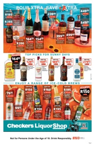 SUMMER FINE WINE FOR SIPPING Not for Persons Under the Age of 18. Drink Responsibly. Page 2 Download the app OFFERS VALID FROM FRIDAY 23/01/2026 UNTIL SUNDAY 08/02/2026. PRICES APPLY TO CHECKERS & CHECKERS HYPER LIQUORSHOPS WESTERN CAPE. WE RESERVE THE RIGHT TO LIMIT QUANTITIES. NO TRADERS PLEASE. SELECTED ITEMS MAY NOT BE AVAILABLE AT CERTAIN STORES. ALL WINE OFFERS ALSO AVAILABLE AT LIQUORSHOP STORES. LIQUOR ONLY AVAILABLE AT STORES WITH A VALID LIQUOR LICENCE. ERRORS & OMISSIONS EXCEPTED (E&OE). WHILE STOCKS LAST. CUSTOMER CARE LINE 0800 01 07 09 (TOLL-FREE). XTRA SAVINGS SUPPORT LINE 0800 33 33 85 (TOLL-FREE). We bring the to you KWV 3-Year-Old Brandy WITH CARD 17999 SAVE R30 750ml Cruz Vodka All Variants Each WITH CARD 26999 SAVE R50 750ml Royal Flush Original/Amber/ Luxe Noir Gin Each WITH CARD 25999 SAVE R40 750ml 2 x 1l Schweppes All Variants WITH CARD ANY 2 FOR R35 2 x 250ml Red Bull Energy Drink All Variants WITH CARD ANY 2 FOR R28 SAVE R12 1l Grant’s Triple Wood/ Summer Orange/ Tropical Fiesta Blended Scotch Whisky Each WITH CARD 26999 SAVE R30 750ml Vat 69 Blended Scotch Whisky WITH CARD 17499 SAVE R35 750ml Johnnie Walker Red Label Blended Scotch Whisky 24999 WITH CARD 750ml SAVE R40 Coppa Cocktail Liqueur All Variants Each 18999 WITH CARD 750ml SAVE R30 WITH CARD 750ml Spier Signature Collection Wine All Variants Each SAVE R15 BUY ANY & Durbanville Hills Wine All Variants Each WITH CARD 7999 SAVE R15 750ml Oakridge · Natural Sweet Rosé · Red · White Wine Each WITH CARD 11499 SAVE R20 3l KWV Collection · Sauvignon Blanc White · Cabernet Sauvignon Shiraz Red Wine - R169,99 Save R20 WITH CARD 13999 SAVE R20 2l Leopard’s Leap Wine All Variants Each WITH CARD 6999 SAVE R15 750ml 6x250ml OR 6x300ml OR 750ml J.C. Le Roux Sparkling Wine Cans/Bottle All Variants WITH CARD 8999 SAVE R15 each 3l 2l EXCLUSIVE! NEW! Buy Both 750ml Aperol & 750ml Cinzano Spritz & GET 1l Schweppes All Variants Each FREE! R349 WITH CARD SAVE R120 FREE DEAL FREE! GET THIS 1l Jack Daniel’s Gentleman Jack Double Mellowed Tennessee Whiskey WITH CARD 36999 SAVE R60 750ml WCLSLCAKGS/E La Gioiosa Brut Prosecco Sparkling White Wine WITH CARD 13999 SAVE R30 750ml Pirani D.O.C Prosecco · Brut · Extra Dry · Millesimato Rosé Sparkling Wine Each WITH CARD 14999 SAVE R30 750ml