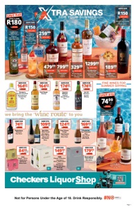 Not for Persons Under the Age of 18. Drink Responsibly. Page 2 TOP PICKS FOR SUNNY DAYS SUMMER’S BEST BREWS Download the app OFFERS VALID FROM FRIDAY 24/10/2025 UNTIL SUNDAY 09/11/2025. PRICES APPLY TO CHECKERS & CHECKERS HYPER LIQUORSHOPS WESTERN CAPE. WE RESERVE THE RIGHT TO LIMIT QUANTITIES. NO TRADERS PLEASE. SELECTED ITEMS MAY NOT BE AVAILABLE AT CERTAIN STORES. ALL WINE OFFERS ALSO AVAILABLE AT LIQUORSHOP STORES. LIQUOR ONLY AVAILABLE AT STORES WITH A VALID LIQUOR LICENCE. ERRORS & OMISSIONS EXCEPTED (E&OE). WHILE STOCKS LAST. CUSTOMER CARE LINE 0800 01 07 09 (TOLL-FREE). XTRA SAVINGS SUPPORT LINE 0800 33 33 85 (TOLL-FREE). 2 x 6x355ml Corona Extra/Cero Beer NRB ANY 2 FOR R190 SAVE R40 WITH CARD 2 x 6x330ml Flying Fish Pressed Lemon Flavoured Beer NRB 2 FOR R145 SAVE R45 WITH CARD 2 x 6x275ml Extreme Original Energy Cider NRB 2 FOR R200 SAVE R50 WITH CARD 2 x 6x500ml Strongbow Premium Dry Apple Cider Cans 2 FOR R235 SAVE R65 WITH CARD WITH CARD Eichbaum Stout Beer Cans SAVE R15 10999 6x500ml Aerstone 10-Year-Old Land/ Sea Cask Single Malt Scotch Whisky WITH CARD 39999 SAVE R100 750ml each Bombay Sapphire London Dry Gin WITH CARD 29999 SAVE R80 750ml High Commissioner Blended Scotch Whisky WITH CARD 17499 SAVE R25 750ml Jim Beam Kentucky Straight Bourbon Whiskey WITH CARD 27999 SAVE R30 750ml Johnnie Walker Black Label 12-Year-Old Blended Scotch Whisky WITH CARD 41999 SAVE R60 750ml Olmeca Reposado/ Silver Tequila/ Dark Chocolate Liqueur WITH CARD 24999 SAVE R80 750ml each Buffelsfontein Brandy WITH CARD 18999 SAVE R30 750ml KWV 10-Year-Old Barrel Select Potstill Brandy WITH CARD 34999 SAVE R70 750ml Russian Bear Vodka All Variants Each WITH CARD 14999 SAVE R30 750ml Wild Africa Cream Liqueur All Variants Each WITH CARD 12999 SAVE R30 750ml 2 x 1,25l Appletiser Sparkling Juice R75 2 FOR J&B Blended Scotch Whisky 20999 WITH CARD 750ml SAVE R50 WCLSLCAIZJ/E_REV 2 x 6x330ml Castle Lite Beer NRB R145 WITH CARD SAVE R45 2 FOR 1,25l 2 x 6x440ml NRB/6x500ml Cans Windhoek Premium Draught Beer 24x440ml NRB/24x500ml Cans Windhoek Premium Draught Beer ANY 2 FOR SAVE R60 R190 R375 SAVE R30 WITH CARD WITH CARD EXCLUSIVE! NEW! 2 x 300ml Babalas Rescue+ Energy Drink WITH CARD 2 FOR 4999 SAVE R10