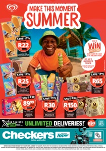 UNLIMITED DELIVERIES!* MONTHLY SUBSCRIPTION R99 ONLY PER MONTH *R350 minimum spend. T&Cs apply. Click here to download the app Ola Paddle Pop Tubes Minis Rasberry & Pineapple Ice Sticks 8999 WITH CARD 10x57ml per pack SAVE R30 BUY ANY 2 OLA PRODUCTS TO ENTER WHATSAPP YOUR TILL SLIP TO 064 863 9292 WIN beach holiday or a share of R1 million in prizes STAND TO 2 x 70ml/80ml/90ml Ola Paddle Pop Twister/Tube Ice Cream All Variants R30 WITH CARD ANY 2 FOR SAVE 25% 2 x 60ml Ola Paddle Pop Rainbow Caramel/Chocolate Flavoured Ice Lolly R25 WITH CARD 2 FOR SAVE 17% 2 x 60ml Ola Paddle Pop Orange Flavoured Ice Lolly R22 WITH CARD 2 FOR SAVE 15% 2 x 5 per pack Ola Magnum Ice Cream All Variants R150 WITH CARD 2 FOR SAVE R94 2 x 90ml/100ml Ola Magnum Ice Cream All Variants R65 WITH CARD ANY 2 FOR SAVE 19% OFFERS VALID FROM MONDAY 10/11/2025 UNTIL SUNDAY 07/12/2025. PRICES APPLY TO CHECKERS & CHECKERS HYPER STORES WESTERN CAPE, EXCEPT BEAUFORT WEST, GEORGE, KNYSNA, MOSSEL BAY, OUDTSHOORN & PLETTENBERG BAY. WE RESERVE THE RIGHT TO LIMIT QUANTITIES. NO TRADERS PLEASE. ERRORS & OMISSIONS EXCEPTED (E&OE). SELECTED ITEMS MAY NOT BE AVAILABLE AT CERTAIN STORES. WHILE STOCKS LAST. CUSTOMER CARE LINE 0800 01 07 09 (TOLL-FREE). XTRA SAVINGS SUPPORT LINE 0800 33 33 85 (TOLL-FREE). WCFOCCDRGP/E