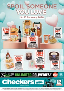 UNLIMITED DELIVERIES!* MONTHLY SUBSCRIPTION R99 ONLY PER MONTH *R350 minimum spend. T&Cs apply. Click here to download the app SPOIL SOMEONE 9 - 15 February 2026 WCFOCLDTJI/E_REV1 NO ALCOHOL MAY BE SOLD TO PERSONS UNDER THE AGE OF 18. FREE! DINNER FOR 2 OFFERS VALID FROM MONDAY 09/02/2026 UNTIL SUNDAY 15/02/2026. PRICES APPLY TO CHECKERS & CHECKERS HYPER STORES WESTERN CAPE, EXCEPT BEAUFORT WEST, GEORGE, KNYSNA, MOSSEL BAY, OUDTSHOORN & PLETTENBERG BAY. WINE ONLY AVAILABLE AT STORES WITH WINE DEPARTMENTS. LIQUOR ONLY AVAILABLE AT STORES WITH A VALID LIQUOR LICENCE. ALCOHOL FOR SALE ON SUNDAYS AT SELECTED STORES ONLY. WE RESERVE THE RIGHT TO LIMIT QUANTITIES. NO TRADERS PLEASE. ERRORS & OMISSIONS EXCEPTED (E&OE). SELECTED ITEMS MAY NOT BE AVAILABLE AT CERTAIN STORES. WHILE STOCKS LAST. CUSTOMER CARE LINE 0800 01 07 09 (TOLL-FREE). XTRA SAVINGS SUPPORT LINE 0800 33 33 85 (TOLL-FREE). Bella Vita Fresh Pizza All Variants & 750ml Roodeberg Classic Blend Red Wine WITH CARD BUY BOTH & SAVE R40 500g The Kitchen Golden/Traditional Syrup Each & 8 per pack The Bakery Flapjacks/30 per pack Mini Flapjacks Each WITH CARD BUY BOTH & SAVE 20% 450g/500g Simply Great Side Salad & 1kg Bella Vita Pasta & 450g Gourmade Malva/Sticky Toffee Pudding All Variants WITH CARD BUY ALL 3 & SAVE 20% The Bakery Chocolate Mousse Cake WITH CARD 9999 SAVE R20 700g BUY 1 x The Bakery Mini Bar-One/ Celebration Cake Each & GET 2 x 42g Nestlé Bar-One Chocolate Bar FREE! SAVE R22 DEAL FREE WITH CARD 250g Foodie! Pasta & 200g Foodie! Fresh Sauce All Variants WITH CARD 9999 SAVE R30 BOTH FOR
