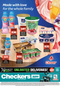 UNLIMITED DELIVERIES!* MONTHLY SUBSCRIPTION R99 ONLY PER MONTH *R350 minimum spend. T&Cs apply. Click here to download the app Made with love for the whole family Clover Plain Double Cream/ Fruits of the Forest Full Cream Yoghurt WITH CARD 34991kg each SAVE R10 Clover Tropika/Bliss Double Cream Drinking Yoghurt WITH CARD 1199250g each ZNFOCCDRTV/E OFFERS VALID FROM MONDAY 24/11/2025 UNTIL SUNDAY 07/12/2025. PRICES APPLY TO CHECKERS STORES AMANZIMTOTI, ARBOUR ARCH, ATHLONE, BALLITO JUNCTION, BALLITO STEPS, BLUFF, BOARDWALK RICHARDS BAY, CASCADES, CORNUBIA, DAVENPORT RD, DURBAN NORTH, EMPANGENI, ESTCOURT, GILLITTS, HILTON, HILLCREST, HILLCREST THE COLONY, HOWICK, KWADUKUZA (STANGER), MARGATE, MICA MALL, MIDLANDS MALL, MOUNT RICHMORE VILLAGE, MTUBA MALL, MUSGRAVE, NEWCASTLE, NEWCASTLE MALL, NORTHDENE, OCEANDUNES SIBAYA, OCEANS MALL, OVERPORT, PORT SHEPSTONE, PRINCESS MKABAYI MALL, QUEENSBURGH, RESERVOIR HILLS, SCOTTBURGH, SCOTTSVILLE, SHELLY BEACH, SOUTHWAY MALL, ST JOHN’S AVENUE, TONGAAT, VIRGINIA CIRCLE, VOLKSRUST, VRYHEID, WATERCREST, WESTVILLE, WINDERMERE & WOODBURN. ALSO AT CHECKERS HYPER BROOKSIDE, GALLERIA, GATEWAY, PAVILION, SHALLCROSS & WESTOWN. WINE ONLY AVAILABLE AT STORES WITH WINE DEPARTMENTS. BEER & SPIRITS ONLY AVAILABLE AT LIQUORSHOP STORES. ALCOHOL FOR SALE ON SUNDAYS. LIQUOR ONLY AVAILABLE AT STORES WITH A VALID LIQUOR LICENCE. CERTAIN FOODS COOKED FOR STYLING PURPOSES ONLY. SEAFOOD ONLY AVAILABLE AT STORES WITH SEAFOOD COUNTERS. WE RESERVE THE RIGHT TO LIMIT QUANTITIES. NO TRADERS PLEASE. ERRORS & OMISSIONS EXCEPTED (E&OE). SELECTED ITEMS MAY NOT BE AVAILABLE AT CERTAIN STORES. WHILE STOCKS LAST. CUSTOMER CARE LINE 0800 01 07 09 (TOLL-FREE). XTRA SAVINGS SUPPORT LINE 0800 33 33 85 (TOLL-FREE). 2 x 6x100g Clover Flavoured Dairy Snack/Yoghurt WITH CARD ANY 2 FOR R35 SAVE R15 2 x 6x100g Clover Plain/Bliss Double Cream/Fruits of the Forest Full Cream Yoghurt WITH CARD ANY 2 FOR R55 SAVE R11 2 x 450g Clover Tropika Granadilla/Mango Peach/Strawberry Drinking Yoghurt WITH CARD ANY 2 FOR R30 SAVE R10