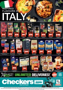 OFFERS VALID FROM MONDAY 06/04/2026 UNTIL SUNDAY 19/04/2026. PRICES APPLY TO ALL KWAZULU-NATAL CHECKERS STORES. ALSO AT CHECKERS HYPER BROOKSIDE, GALLERIA, GATEWAY, PAVILION, SHALLCROSS & WESTOWN. CERTAIN PRODUCTS MAY NOT BE AVAILABLE AT ALL FOOD STORES. WE RESERVE THE RIGHT TO LIMIT QUANTITIES. NO TRADERS PLEASE. ERRORS & OMISSIONS EXCEPTED (E&OE). SELECTED ITEMS MAY NOT BE AVAILABLE AT CERTAIN STORES. WHILE STOCKS LAST. CUSTOMER CARE LINE 0800 01 07 09 (TOLL-FREE). XTRA SAVINGS SUPPORT LINE 0800 33 33 85 (TOLL-FREE). ITALY INSPIRED FLAVOURS OF 2 x 200g Willow Creek Pitted Olives ANY 2 FOR R50 SAVE R10 WITH CARD Royco Pasta Sauce 4999400g each SAVE R5 WITH CARD 2 x 38g Knorr Sauce ANY 2 FOR R30 SAVE R6 WITH CARD Goldcrest Pesto 4999 140g WITH CARD 2 x 125g Willow Creek Olive Pesto ANY 2 FOR R50 SAVE R20 WITH CARD 3 x 400g Earthwise Peeled & Diced/Peeled Tomato ANY 3 FOR R55 SAVE R11 WITH CARD Serena Chopped/Whole Peeled Tomatoes in Tomato Juice Each 1999400g SAVE R5 WITH CARD Pot O’ Gold Whole Italian Peeled/ Diced Tomatoes/Tomato & Onion Mix in Tomato Juice 1799400g each WITH CARD 2 x 250g Serena Durum Wheat/Spinach Lasagne Pasta ANY 2 FOR R65 SAVE R25 WITH CARD Serena Pasta Shapes 2999 500g SAVE R8 WITH CARD Rollout Foods Frozen Standard Pizza Bases 79994 per pack SAVE R10 WITH CARD Fatti’s & Moni’s Pasta Shapes 1999500g WITH CARD Bella Vita BBQ Chicken/Chicken Lasagne/ Tagliatelle Alfredo/Mac Bacon/ Beef Lasagne Pasta 17999 900g/ 1kg each SAVE R20 WITH CARD ZNFOCCDUJF/E UNLIMITED DELIVERIES!* MONTHLY SUBSCRIPTION R99 ONLY PER MONTH *R350 minimum spend. T&Cs apply. Click here to download the app 3 x 50g Blue Crane Tomato Paste 3 FOR R15 SAVE R9 WITH CARD Serena Gnocchi Potato Dumplings 4999 500g SAVE R5 WITH CARD Serena Capelli D’Angelo/Tagliatelle Pasta 5499500g each WITH CARD Ina Paarman’s Pasta Sauce 6999400g each SAVE R10 WITH CARD 2 x 400g Denny Pasta Sauce ANY 2 FOR R100 SAVE R20 WITH CARD Mesty Extra Virgin Olive Oil 179991l SAVE R20 WITH CARD 2 x 48g Denny Dry Cook-in/Pasta Sauce ANY 2 FOR R35 SAVE R5 WITH CARD 1l Serena Cannelloni Pasta Tubes 3999250g each WITH CARD 2 x Dr. Oetker Ital Pizza Classic ANY 2 FOR R110 SAVE R40 WITH CARD