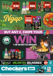 DISCOVER MORE www.whatsfordinner.co.za Make it Competition ends: 7 December 2025. For more information see www.termsconditions.co.za See till slip for details. Selected stores have limited range. T&Cs apply. *Image shown is for display purposes only UNLIMITED DELIVERIES!* MONTHLY SUBSCRIPTION R99 ONLY PER MONTH *R350 minimum spend. T&Cs apply. Click here to download the app ZNFOCCDQIL/E 1 OF 90 KETTLE BRAAIS BUY ANY 2,SWIPE YOUR & STAND TO 2 x 340ml Knorr Salad Dressing ANY 2 FOR R60 SAVE R20 WITH CARD 3 x Knorr Instant Gravy ANY 3 FOR R30 SAVE R24 WITH CARD Robertsons Masterblends Spice Blend 3199200ml each SAVE R18 WITH CARD OFFERS VALID FROM MONDAY 20/10/2025 UNTIL SUNDAY 09/11/2025. PRICES APPLY TO CHECKERS STORES AMANZIMTOTI, ARBOUR ARCH, ATHLONE, BALLITO JUNCTION, BALLITO STEPS, BLUFF, BOARDWALK RICHARDS BAY, CASCADES, CORNUBIA, DAVENPORT RD, DURBAN NORTH, EMPANGENI, ESTCOURT, GILLITTS, HILTON, HILLCREST, HILLCREST THE COLONY, HOWICK, KWADUKUZA (STANGER), MARGATE, MICA MALL, MIDLANDS MALL, MOUNT RICHMORE VILLAGE, MTUBA MALL, MUSGRAVE, NEWCASTLE, NEWCASTLE MALL, NORTHDENE, OCEANDUNES SIBAYA, OCEANS MALL, OVERPORT, PORT SHEPSTONE, PRINCESS MKABAYI MALL, QUEENSBURGH, RESERVOIR HILLS, SCOTTBURGH, SCOTTSVILLE, SHELLY BEACH, SOUTHWAY MALL, ST JOHN’S AVENUE, TONGAAT, VIRGINIA CIRCLE, VOLKSRUST, VRYHEID, WATERCREST, WESTVILLE, WINDERMERE & WOODBURN. ALSO AT CHECKERS HYPER BROOKSIDE, GALLERIA, GATEWAY, PAVILION, SHALLCROSS & WESTOWN. WE RESERVE THE RIGHT TO LIMIT QUANTITIES. NO TRADERS PLEASE. ERRORS & OMISSIONS EXCEPTED (E&OE). SELECTED ITEMS MAY NOT BE AVAILABLE AT CERTAIN STORES. WHILE STOCKS LAST. CUSTOMER CARE LINE 0800 01 07 09 (TOLL-FREE). XTRA SAVINGS SUPPORT LINE 0800 33 33 85 (TOLL-FREE). FREE! BUY 2 x 200g Robertsons Braai & Grill All-in-One Spice/ BBQ Spice & GET a 3rd one FREE! WITH CARD SAVE R27 FREE & GET A 3RD BUY ANY 2